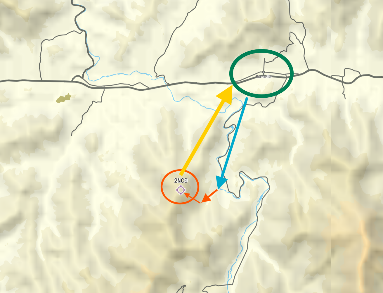 - 在伯恩斯维尔东南边,可见一处很窄山谷,之后还有一处较宽的南北向山谷;