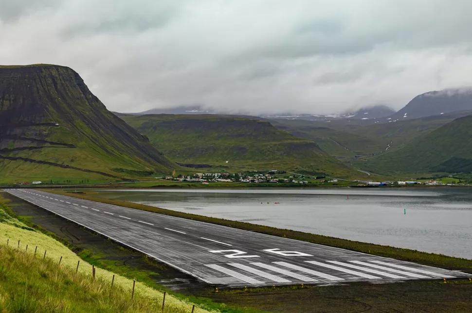 由于地形限制,该机场仅允许从东北边的峡湾开始目视进近。
