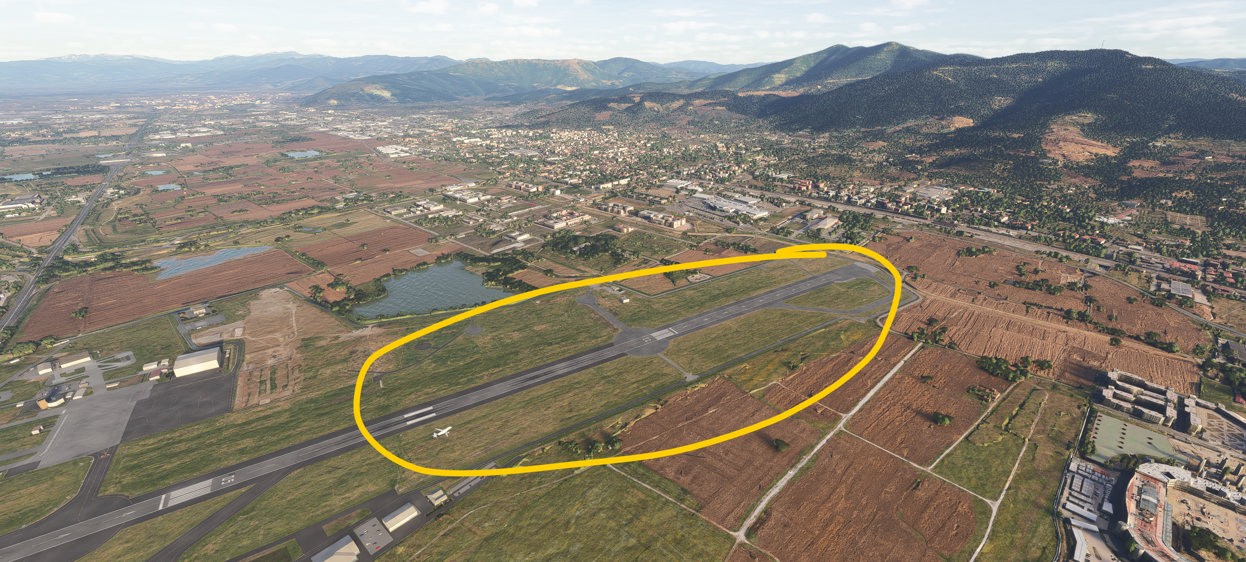 - 贴着右手边的山(东北边)飞行,以此作为 第四边(Base),最低保持离地高度 500ft;
