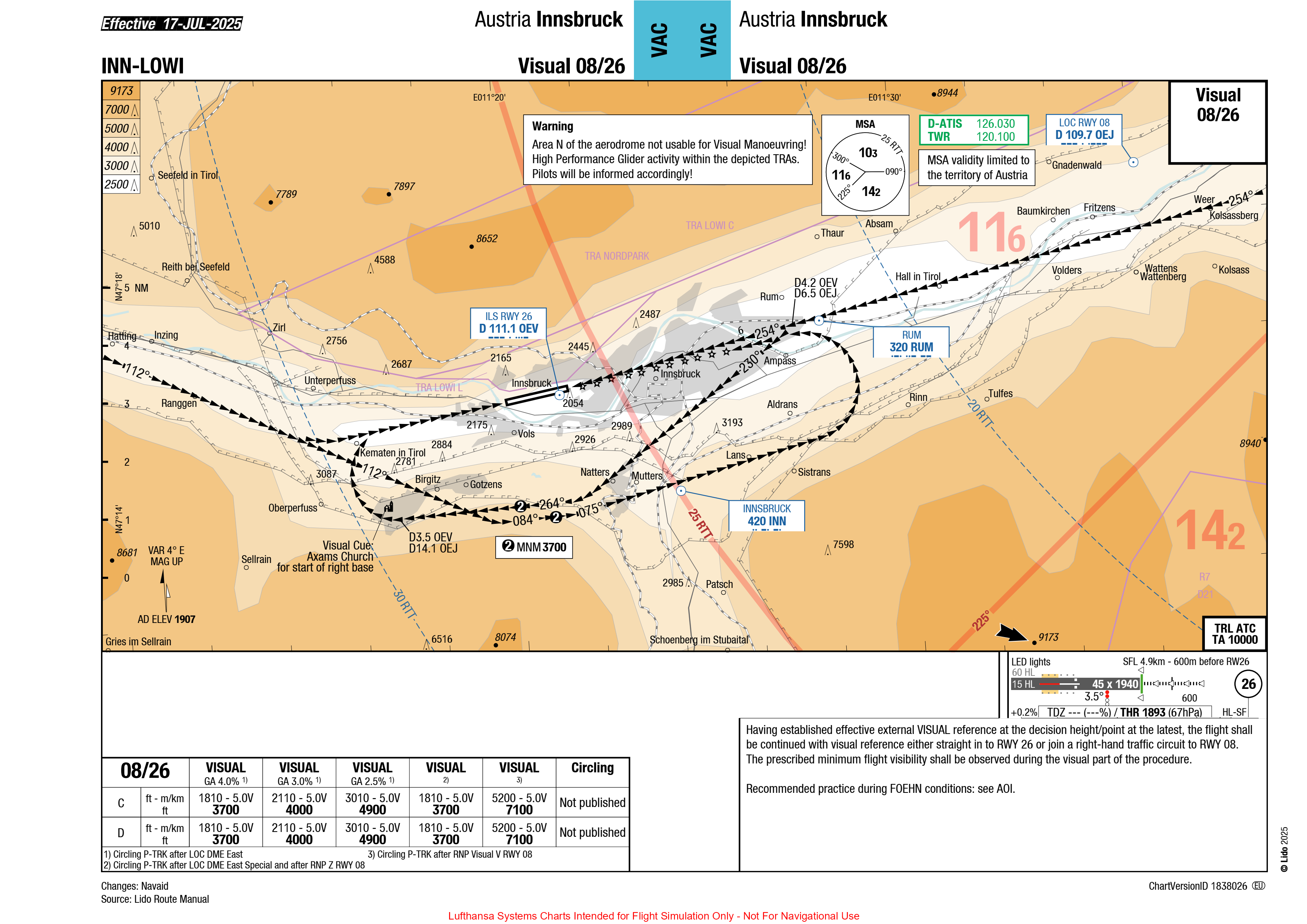 26 跑道航向道稍微左拐,之后贴着左侧(南边)的山谷,以此作为 第三边(Downwind),形成右手三边目视进近,目视降落到08 跑道: - 在 第三边 时高度最低 3700ft;