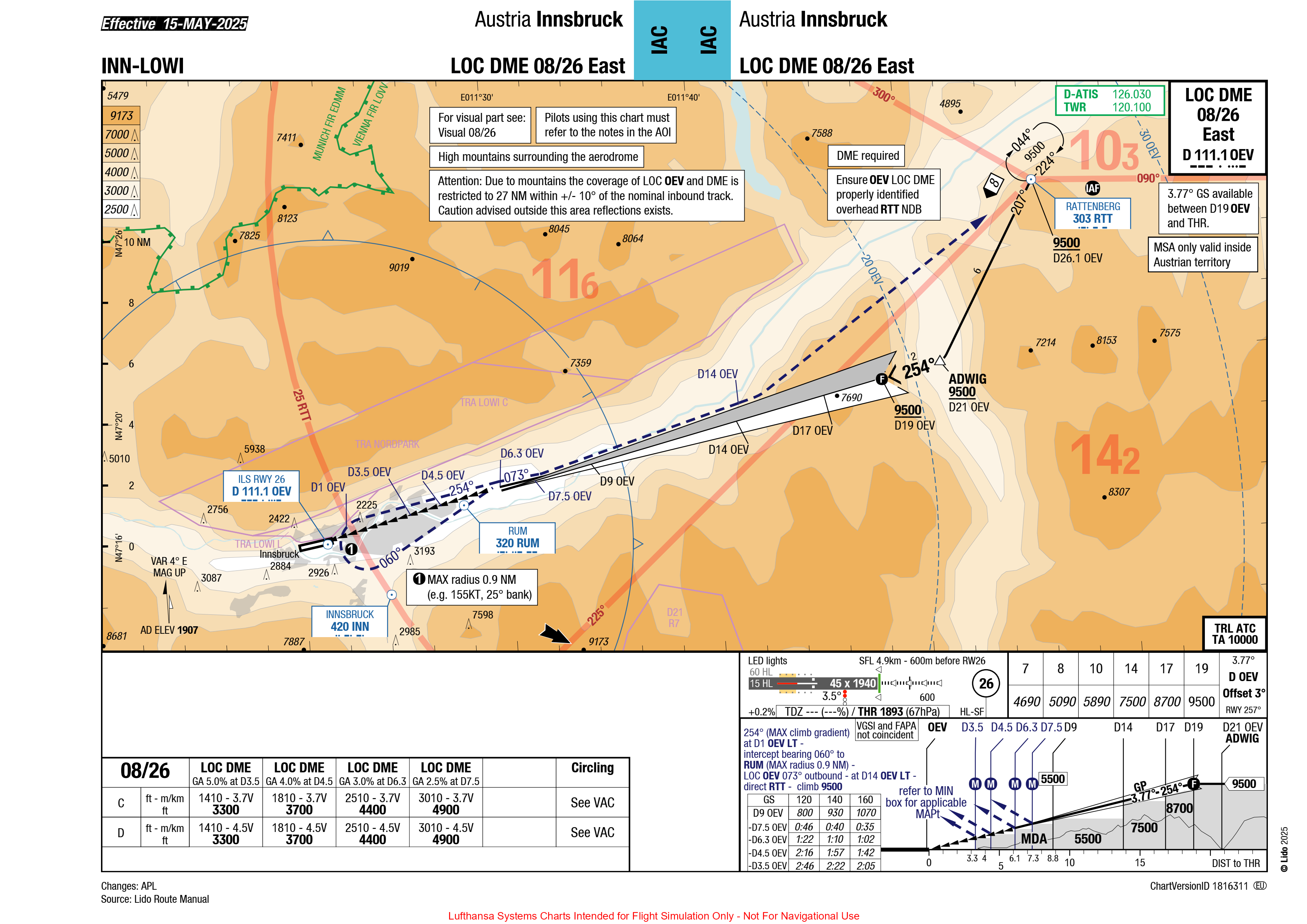 26 跑道的 航向道(Localizer)111.1 OEV,按 254° 航迹飞向26 跑道; - 在最低决断高度前,脱开自动驾驶,按下面的航图目视飞行;