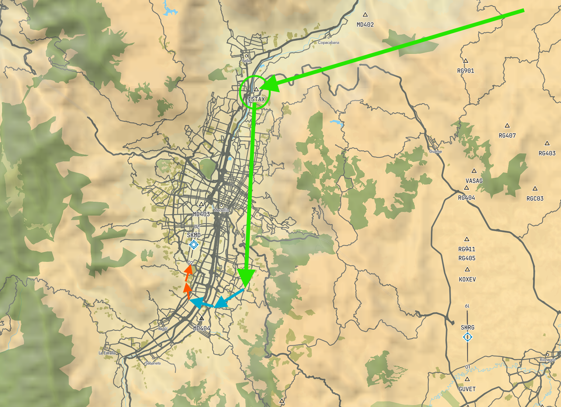 机场位于一座山谷中,在机场以北,设有航点 ISTAX:以该航点为目标,目视决飞入山谷,之后沿山谷南下,找到机场。