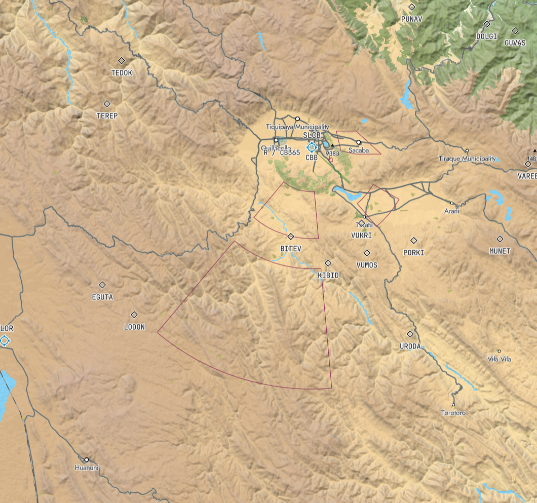 由于机场所处在一个山谷中,周边还有多个禁飞区(下图红框区域),所以提供了该进近程序,引导飞机安全的飞入山谷。