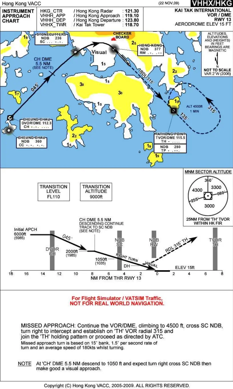 112.3 CH导航台; - 经过导航台后继续沿 045° 航向飞行,同时持续下滑,在距离导航台 5.5nm 时高度约为 2000ft;