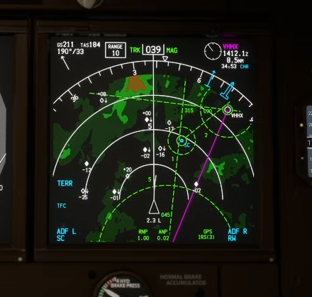 MM信号,并看到棋盘山; MM信号位置为决断点,决断高度为 660ft;- 此时在下方也可以看到转向引导灯;