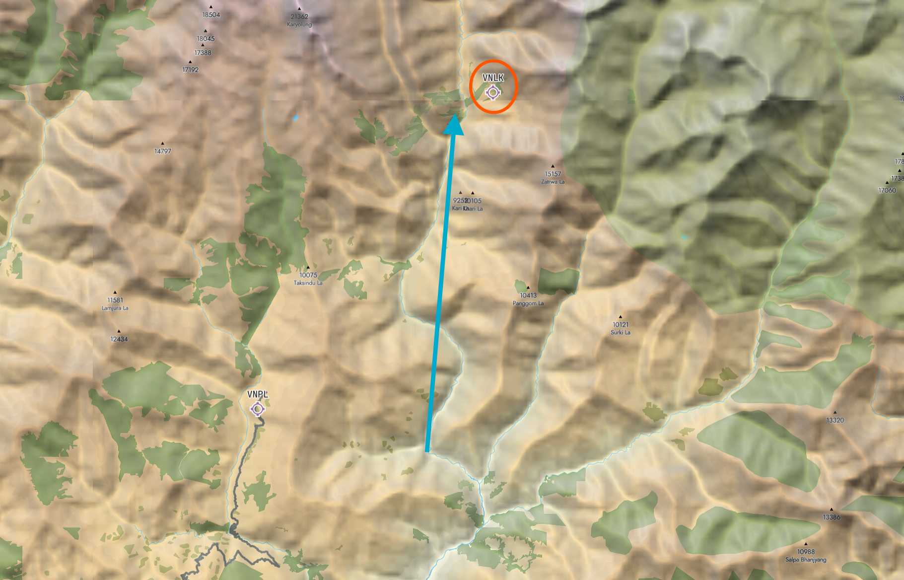 如果对周边地形不熟悉,或者南边气象环境不佳,可先以至少 13000ft 的高度飞过机场上空,之后向南方的山谷飞行,不远处有一块开阔地带,可供掉头转向。