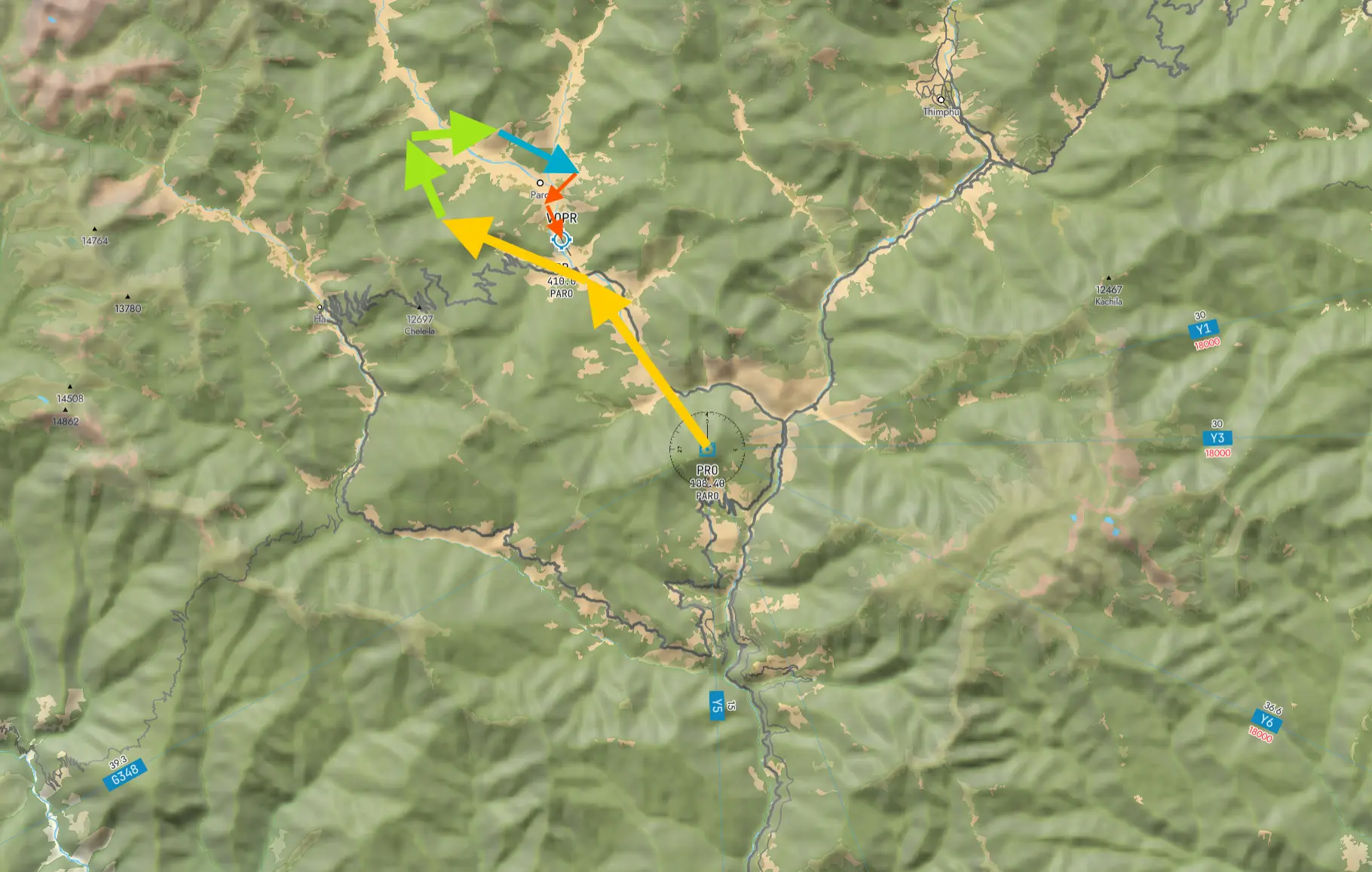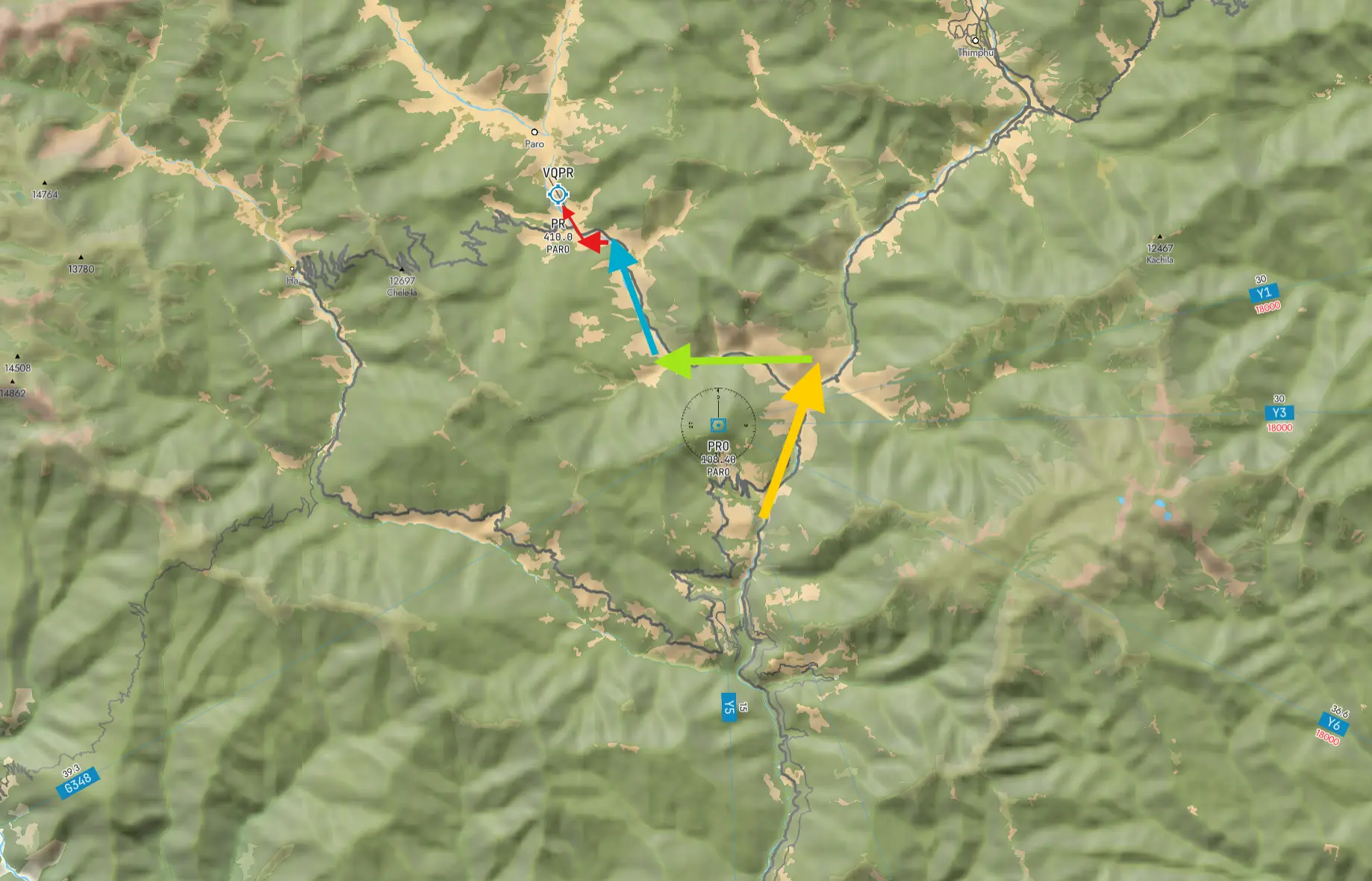 - 进入山谷后,逐渐下降,在导航台北边约为 10000ft(金色线路末端);